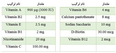 ویتامین های B6 و B12 و همچنین شامل بتاکاروتن، D3، فولیک اسید و