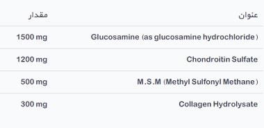 گلوکوزامین قند آمینی ضروری جهت سنتز و تولید کارتیلاژ مفاصل می باشد. کندروئیتین به میزان زیادی در مایع بین مفصلی (سینوویال) وجود دارد و وظیفه آن نرم کردن، ضربه گیری و حفظ لغزندگی مفاصل می باشد. ام اس ام ترکیبی ضروری جهت حفظ الاستیسیته و انعطاف پذیری مفاصل می باشد و همچنین نقش موثری در کاهش درد، بهبود التهاب و تورم در مفاصل آسیب دیده، بهبود جریان خون و کاهش اسپاسم عضلات اطراف مفاصل بر عهده دارد.